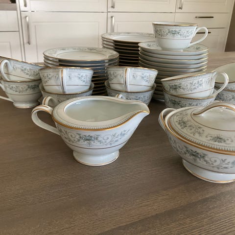 Søtt og gammelt thè-servise med 6 kopper, melkekanne, thekanne, 11 tallerkner og sukkerskål selges.