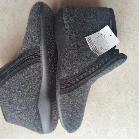 Varme tøfler til herre, størrelse 46. Med tykk såle, tror det er gummi. Filt og «teddyfôr» (usikker om det er ull, tror ikke det er).