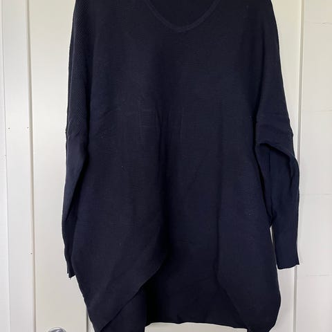 Hel nydelig genser i en varm blåfarge. Båthals og strikk fra mansjett til mansjett uten sydde ermer, se eget bilde. Som ny