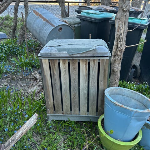 Utendørs avfallsbeholder i metall med blå frontpaneler. Beholderen har lokk som kan åpnes oppover og innvendig ramme for plassering av sekk. Egner seg til avfallshåndtering utendørs, for eksempel ved husvegg, i gårdsrom eller ved inngangsparti. Konstruksjonen er i metall for økt slitestyrke og enklere rengjøring.