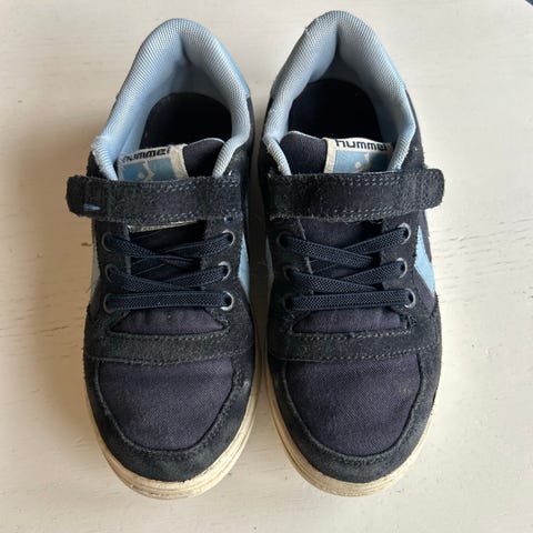Hummel joggesko i størrelse 25, mørk blå og hvit. Skoene har noe slitasje på innsiden rundt åpningene, og bitte litt slitt på tuppen. I bruk ser de helt fine ut. Masse bruk igjen når våren kommer😊