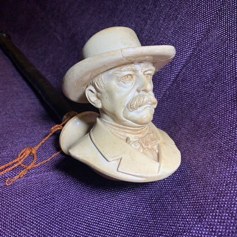 Selger en gammel figural tobakkspipe i metall, trolig fra slutten av 1800-tallet (ca. 1870–1900).