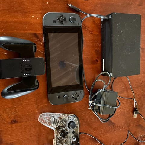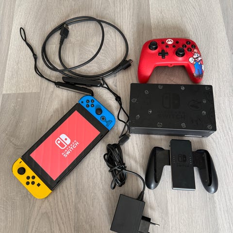 Nintendo Switch konsoll med Joy-Con i lilla og gul farge. Konsollen leveres med dokkingstasjon, strømadapter ( ikke orginal ) og tilkoblingskabler ( orginal )slik at den kan brukes både håndholdt og koblet til TV.