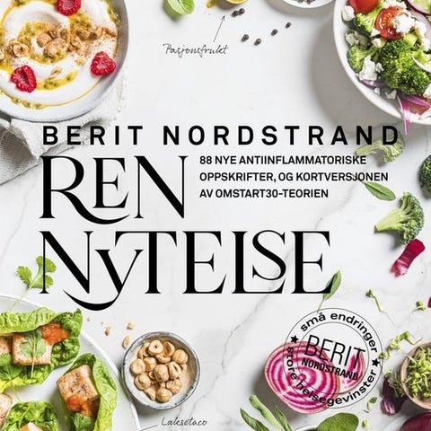 Berit Nordstrand Ren Nytelse kokebok. Boken inneholder oppskrifter med fokus på matretter og drikker presentert med fargebilder. Inne i boken vises blant annet oppskrifter på desserter, kaker, smoothies og andre retter med frukt, bær, nøtter og grønnsaker. Innbundet utgave med mange helsides fotografier av ferdige retter og ingredienser.
