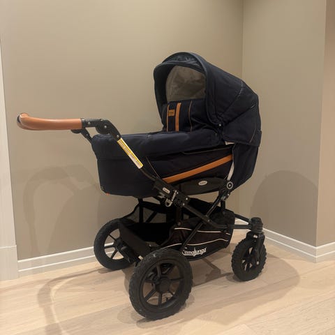 Helt super vogn å bruke både i terreng, i byen, på senteret, butikken osv. Veldig deilig med 4 "stive" dekk, gjør vogna enkel å trille, og kan gå omtrent over alt.