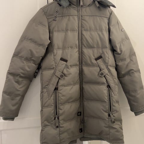 Jean Paul vinterjakke for dame i størrelse M. Jakken er i beige farge og laget i nylon. Modellen har vattert, quiltet design med høy krage og glidelåslukking foran. Det er synlig Jean Paul-logo på ermet. Passer som ytterjakke i den kalde årstiden.