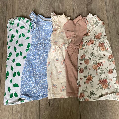 Selger en klespakke med 13 sommerkjoler i str 134-14, stort sett fra HM. Alle klærne er brukt, noen mye andre mindre, men alt er pent og helt. Alt vasket før salg.