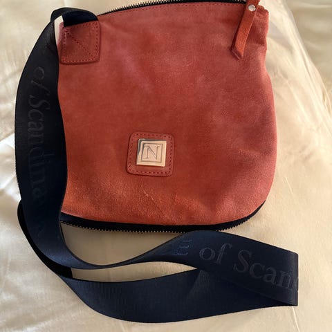 Lite brukt rød orange crossover fra Nude of Scandinavia. Fargen på bildet viser litt mere orange farge enn virkeligheten. Semsket skinn. 20x22 cm