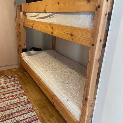 Solid køyeseng i heltre furu selges. Ligger i Oslo på Skullerud. Pent brukt som gjestesenger hjemme hos svigerforeldrene. Madrassene er enkle i skum og kan følge med. En overmadrass kan også følge med. Madrassmål både oppe og nede er 80x200 cm.