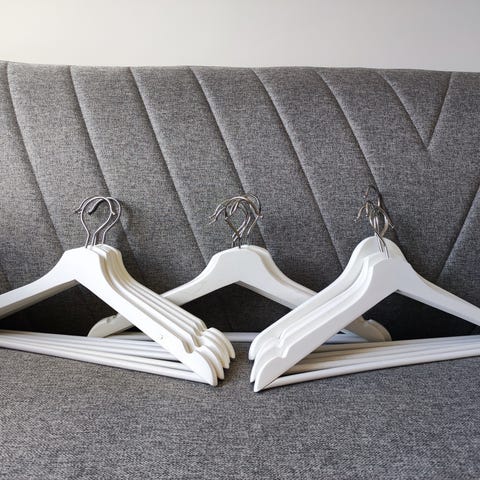 8 vintage kleshengere trukket i kul rød skai. Fra 1950-1960 årene. To av hengerne er også vattert under skai’en (de to til høyre i bildet).