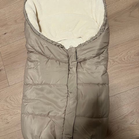 Grå vognpose egnet for bruk i barnevogn. Posen har åpninger for selefester og kan tilpasses de fleste vogner med standard seleløsning. Det følger med forlengerdel.