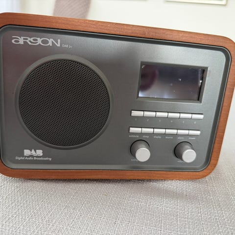 Argon internettradio med fargeskjerm. Enheten har hovedmeny med funksjoner som internettradio, Spotify, musikkspiller, vekkerklokke og søvnfunksjon, slik det vises på skjermen. Fronten har innebygd display som viser menyer, klokke og informasjon om avspilling. Radioen leveres med nettadapter med to-pins plugg for strømtilkobling. Farge og materiale fremstår som sort plast/kompositt basert på bildene.