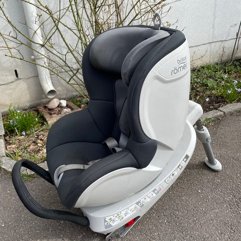 Britax Römer barnesete i størrelse 18. Barnesetet har integrert internsele med polstrede skulderputer og justerbar hodestøtte. Setet festes med Isofix-beslag i bilen, som gir en fast og stabil montering. Trekket er i mørk, ensfarget tekstil. På siden av setet er det tydelige instruksjoner for korrekt montering og bruk, inkludert informasjon om plassering i forhold til airbag. Egnet som bilstol til barn innenfor vekt- og høydeområdet som tilsvarer størrelse 18, i henhold til produsentens spesifikasjoner.
