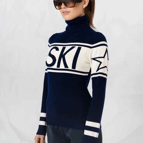 Famme høyhalset genser for dame i størrelse L. Genseren er hvit med sorte kontrastfelt og stor «SKI»-tekst foran, samt stjernedetaljer på ermene. Laget i en blanding av merinoull, tencel, nylon og lycra som gir et mykt og behagelig plagg som kan brukes både som mellomlag og som enkel genser. Høy hals gir ekstra varme rundt nakke og hals. Passer til fritidsbruk og aktiviteter utendørs i kjøligere vær.
