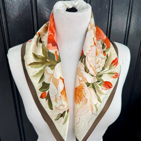 Mykt og behagelig. Veldig fin silke i skjerfet. 100% silke i den beste silke kvaliteten. Enkelt å dandere på ulike måter siden silken er så fin. Helt som nytt. Størrelse 53x53cm. Kan gjerne sende med posten til 46.-