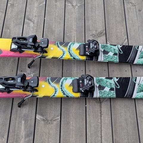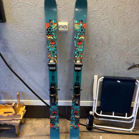 K2 Missy twintip alpinski i lengde 149cm. Skiene har turkis toppsheet med grafisk mønster og er utstyrt med integrerte bindinger. Kun brukt en gang