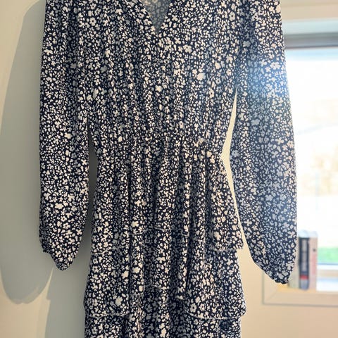 Lett og pen kjole fra Floyd med godt elastisk strikk i livet. Kjolen har veldig god stretch og legger seg veldig pent på. Den har tre lag med «rysjer» og er åpen i halsen. Kjolen fremstår som ny.