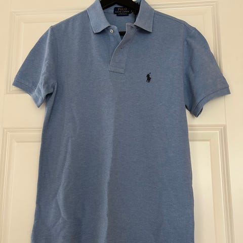 Ralph Lauren Polo pique for herre i størrelse L. Kortermet poloskjorte i blå bomull med kamuflasjemønster. Klassisk krage med knappestolpe og brodert logo på brystet. Laget i bomull for myk og behagelig passform. Passer til hverdagsbruk og fritid.