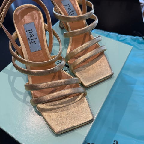 Flotte, gullfargede høyhælte sandaletter fra svenske Dasia – et merke kjent for å kombinere stilren design med god komfort .