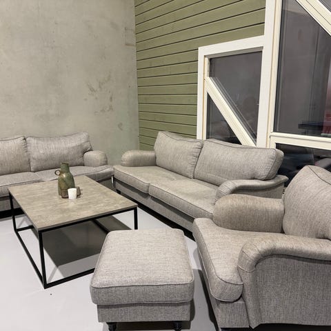 Flott loungesett med hjørnesofa, 2 stoler og bord