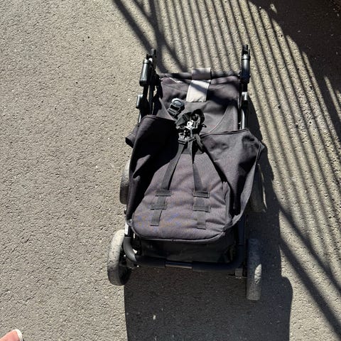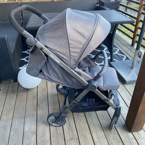 Twistshake barnevogn i grå tekstil med sort understell. Vognen har fire hjul med dreibare forhjul og brems på bakhjulene. Setet har kalesje og frontbøyle, og det er oppbevaringskurv under setet. Vognen kan legges sammen for enklere lagring og transport, slik som vist på bildene. Egner seg som barnevogn til hverdagsbruk og korte turer.