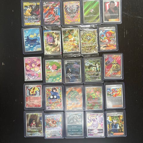 Selger pokemon kort fra 2006 og oppover prisene på kortene står på post-it lappene som henger på kortet😁