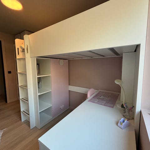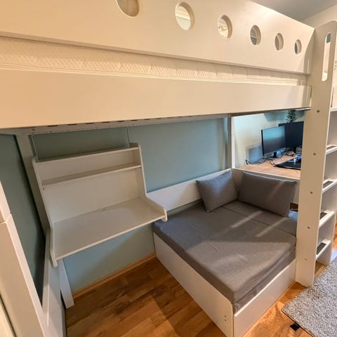 Selger denne flotte sengen i merket Småstad fra Ikea grunnet flytting. Den er hel og fin, men med et skrapemerke på fremsiden av sengen (se bilde). Pulten under kan man og sette utover at den står inntil kortsiden.
