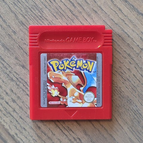 Nintendo Pokémon Red spillkassett for Game Boy. Rød kassett med etikettmotiv fra spillet. Egnet for bruk på kompatible Game Boy-konsoller som støtter originale Game Boy-spillkassetter.