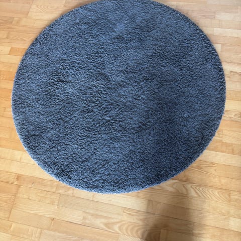 Rundt grått teppe i nøytral farge. Passer godt på soverom, stue eller hjemmekontor. Teppet har kort lugg og jevn overflate som gjør det enkelt å holde rent og gir et mykt underlag på gulvet. Egner seg som gulvteppe under bord, ved seng eller som et eget sone-teppe i rommet.