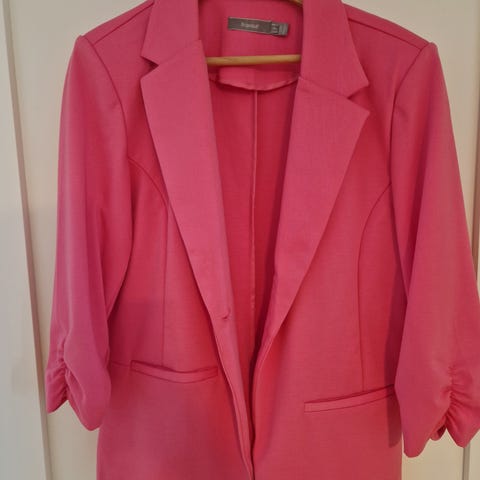 Fransa blazer jakke for dame i størrelse XL. Jakken er rosa og laget i polyester. Klassisk blazerfasong med jakkeslag og lange ermer. Passer til bruk både til hverdags og mer formelle anledninger, og kan kombineres med ulike overdeler og bukser eller skjørt.