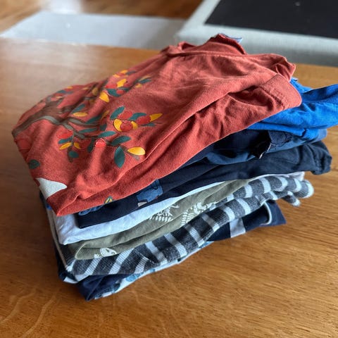 Klespakke med ulltrøye, ullgenser, tskjorter, turbukse. 7 plagg