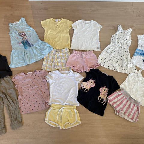 Alle klærne er pent eller lite brukt, mye er kjøpt nytt av meg og brukt til ett barn mens noe er kjøpt brukt eller arvet. Jeg har sett over klærne og tatt bilder av anmerkninger. Passer til vår, sommer og høst. Pakken inneholder klær fra Name it, Lindex, newbie, HM, PoP, Wheat:, Zara:
