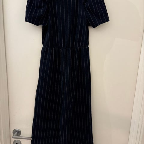 H&M jumpsuit i svart farge, størrelse 134. Laget av 100 % lyocell, et materiale kjent for å være mykt og pustende. Jumpsuiten har smale skulderstropper, regulerbare skuldre, og knapper foran som dekorative detaljer.