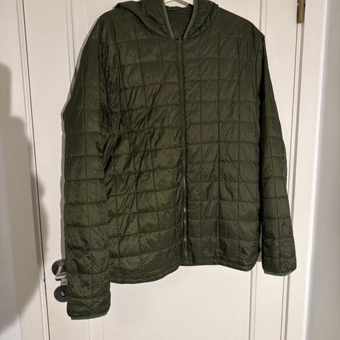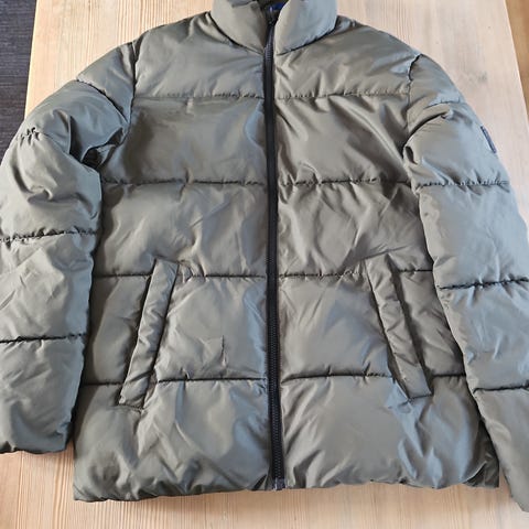 Selger en stilig og praktisk quiltet jakke fra BLEND Denim, størrelse M. Jakka er i en fin olivengrønn farge med klassisk diamantmønster og hette. Perfekt til vår, høst og milde vinterdager.