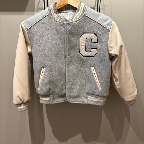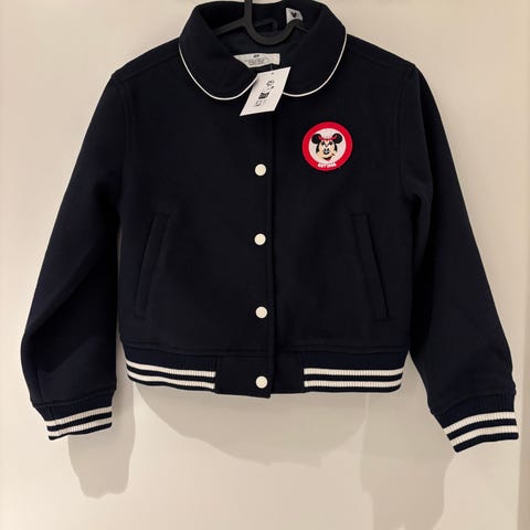 Tøff jakke med armer i skinnimitasjon i offwhite,selve jakken er mørkeblå med rød og offwhite dekor. Ikke synlig brukt.