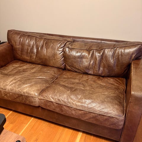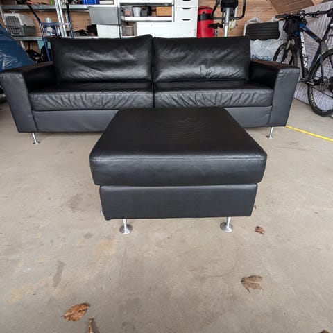 Skinnsofa gis bort, stått i oppvarmet garasje og passer nokk best til det :) god å sitte i.