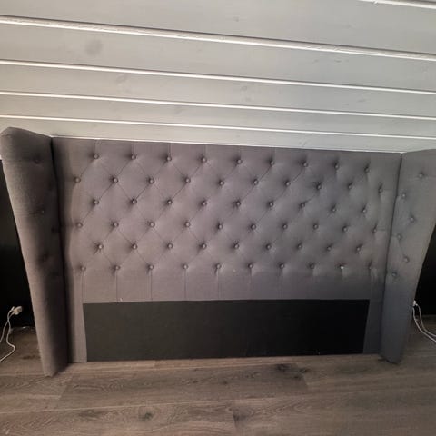 Sengegavlen har knapper i front og med myk polstring for behagelig støtte når man sitter i sengen. Medfølger svarte trebein på 14 cm. Fargen er blåsvart. Det har kommet en liten rift i trekket på baksiden (som er inn mot veggen), men det forringer ikke bruk.