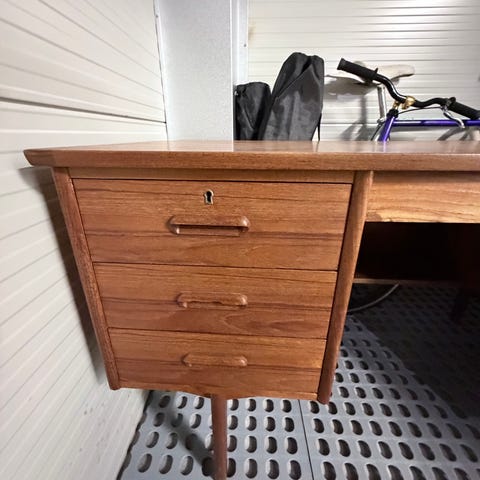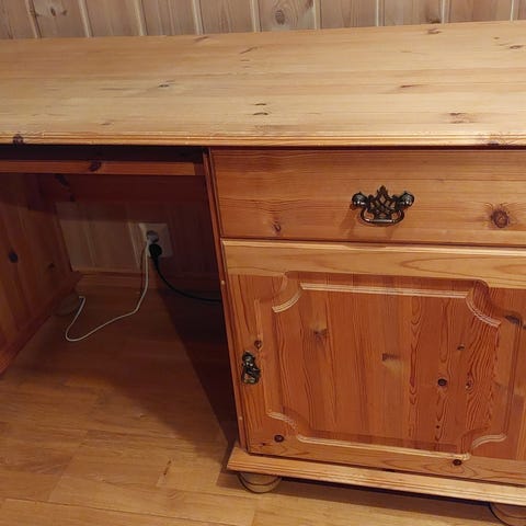 Skrivebord i tre med rektangulær bordplate og brun finish. Bordet har tre skuffer øverst, samt to skapdører under på hver side som gir ekstra oppbevaringsplass. Åpningen i midten gir plass til stol og bein. Egner seg som arbeidsbord eller skrivebord i hjemmekontor, stue eller soverom. Fleksibel på pris, må hentes