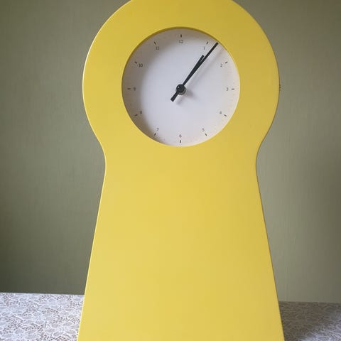 Selger en klassisk IKEA PS 1995-klokke i en flott og dristig rødfarge. Dette er den originale modellen, ofte kalt «nøkkelhullklokken», designet av Thomas Eriksson. Den ble lansert i IKEAs aller første PS-kolleksjon og er i dag et ettertraktet samlerobjekt, utstilt i designmuseer verden over.