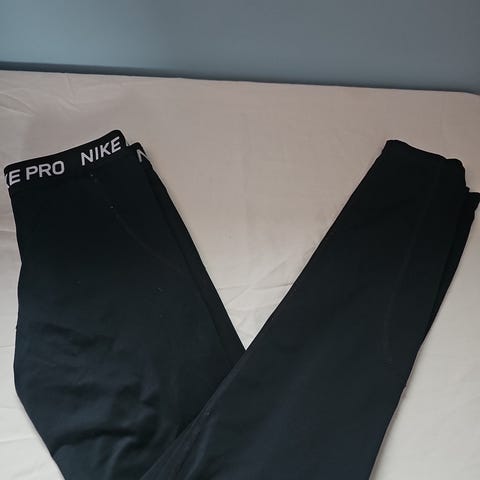 Nike Pro Dri-Fit treningstights for dame i størrelse S. Tightsen er grå med bred, svart elastisk linning med Nike Pro-logo, i tillegg er det en nike logo på leggen. Laget i et teknisk Dri-Fit-materiale som transporterer fukt bort fra huden under aktivitet.