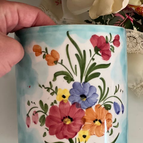 Vase i keramikk med blomstermotiv. Vasen ligner en blomst sett forfra, med rosa overflate og gul detalj i midten. Egner seg til små planter eller snittblomster, og kan plasseres på bord, hylle eller vinduskarm som dekorativ innredningsdetalj.