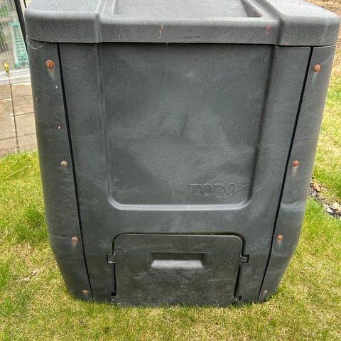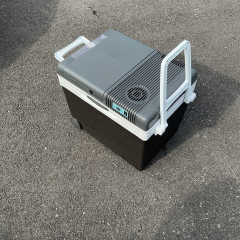 Elektrisk kjøleboks i grå plast. Lokket har integrert kjøleenhet med ventilasjonsriller på toppen. Bærehåndtak er litt løst, og merker på lokket.Strømtilkobling via kabel