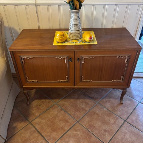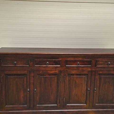 Sjenken er fra 1950-tallet. Den er lakkert og i heltre. Høyde 75 cm, dybde 50 cm og lengde 147 cm.