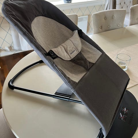 Beemoo vippestol i grå tekstil. Vippestolen har polstret sete med integrert sele.