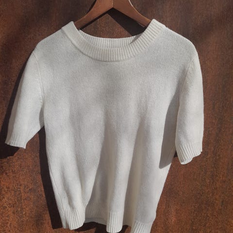 Myk og deilig topp i 100 % kasjmir i en vakker kremfarge. Klassisk og tidløs modell med korte ermer som passer perfekt både alene eller under en jakke eller cardigan.