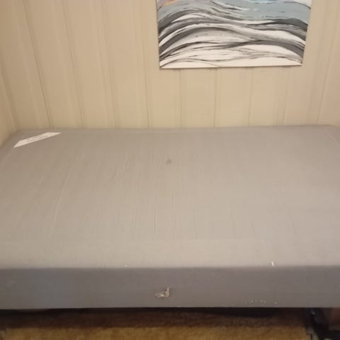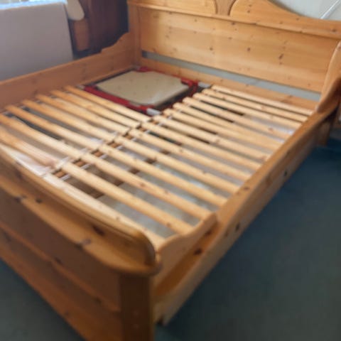 Fin heltre-seng gis bort. Støtte under midtbjelken må ordnes, ellers god stand. Madrass medfølger.