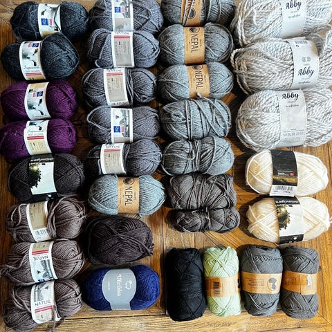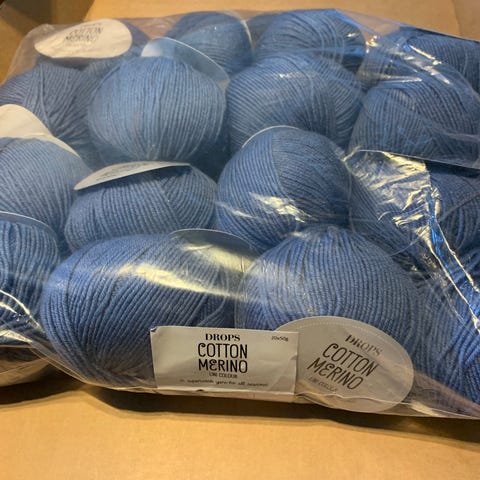 Drops Eskimo garn i ull. Flere nøster i blandede farger, blant annet grå, svart, blå og bruntoner. Etiketten viser anbefalt pinnestørrelse 8 mm og strikkefasthet 11 masker x 15 rader på 10 x 10 cm. Garnet egner seg til tykke plagg og tilbehør som luer, skjerf og gensere, samt andre prosjekter som krever varmt og mykt ullgarn.