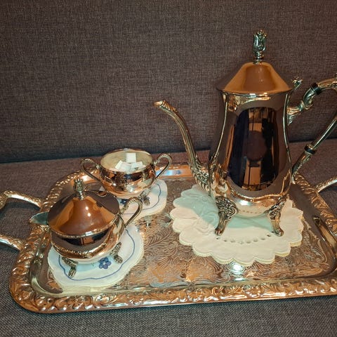Kaffekanne, sukkerskål og fløtemugge samt to serveringsbrett i sølvplett. Selges samlet.
