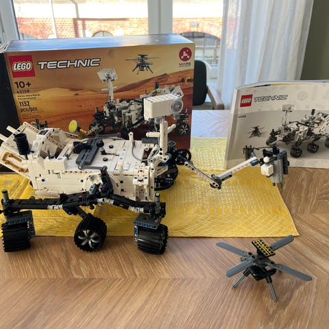 Modellen forestiller NASAs Mars-rover Perseverance med bevegelige hjul og arm, samt helikopterdrone. Settet består av tekniske LEGO-elementer som monteres til en detaljert romfartmodell egnet for bygging og lek eller utstilling.