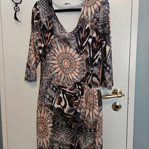 Zara hverdagskjole for dame i størrelse M. Kjolen er flerfarget med mønster og er laget i polyester. Den har lange ermer og knelengde (anslått ut fra bildene). På baksiden er det åpning med små sløyfedetaljer. Passer til hverdagsbruk eller enkle anledninger.